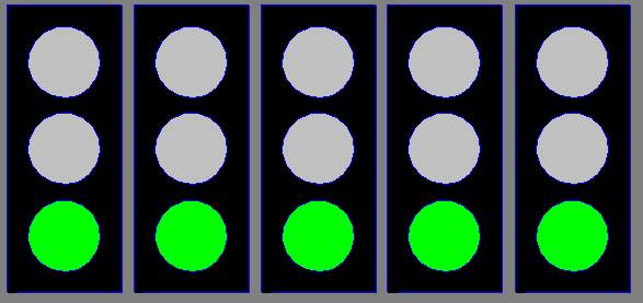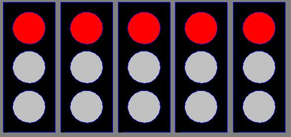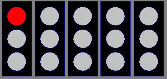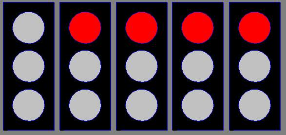 startovním roštu, a poté se začnou v intervalu jedné vteřiny postupně rozsvěcovat červená světla |