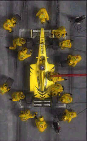 0s až 2s Po předchozím upozornění rádiem přijíždí jezdec do boxů a zastavuje na přesně označeném místě, kde už na něj čeká připraveno 20 mechaniků. Po zastavení se před jezdce objeví "lízátko" s nápisem STOP. Dva mechanici připevní tankovací hadici k nádrži, mezitím další dva - po jednom vpředu a vzadu zvednou auto do vzduchu. Mechanici určení k výměně gum povolí šrouby kol pomocí speciální pistole. 2s až 4s 4s až 6s |